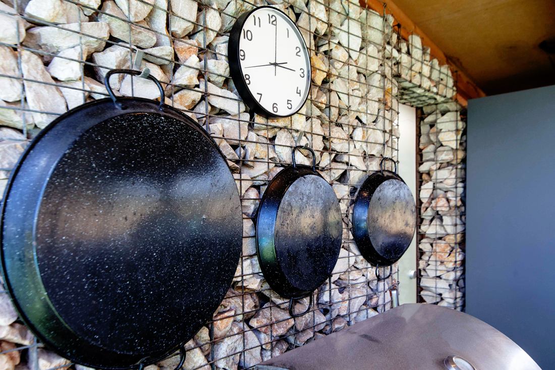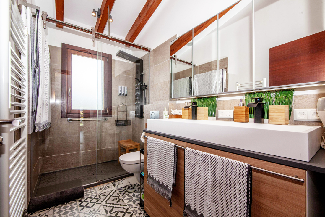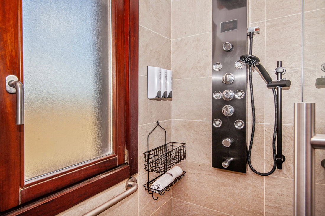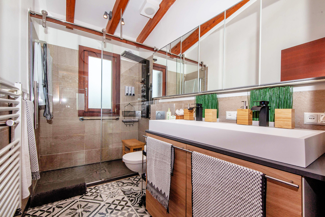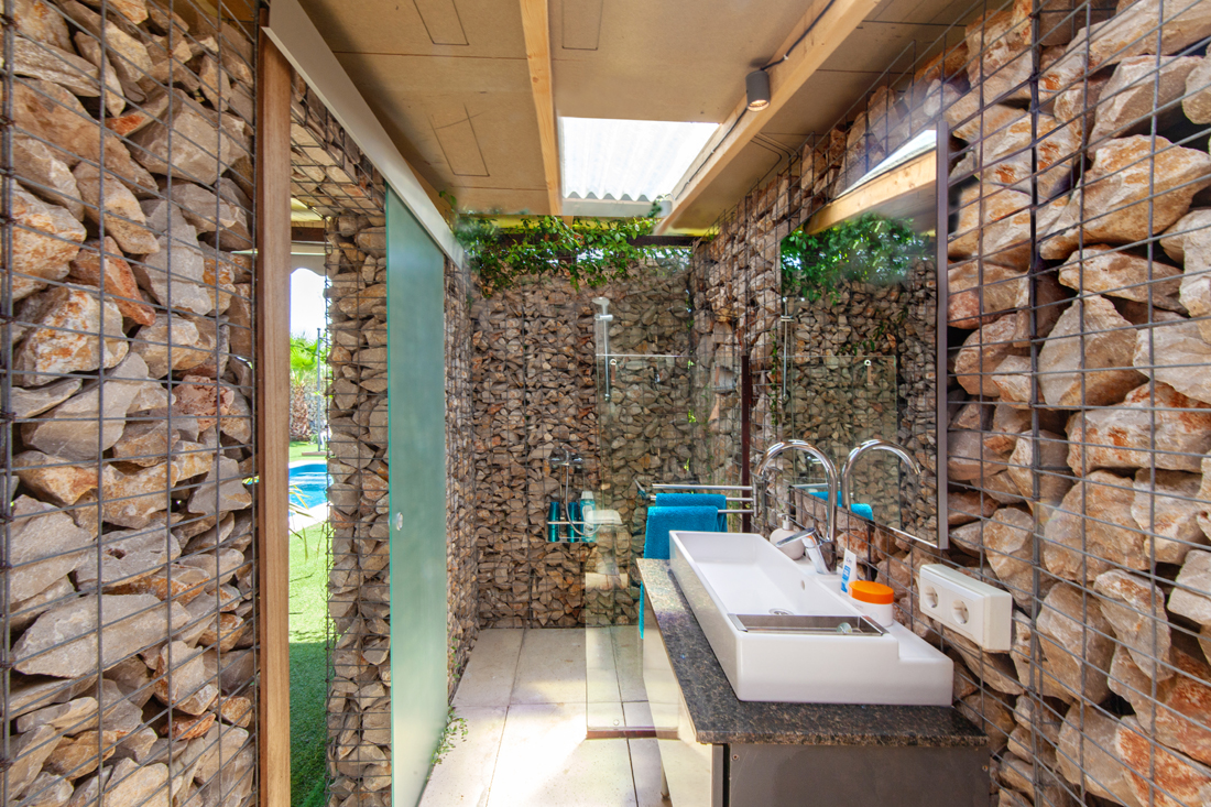 There are 3 bathrooms. One is located outdoors at the pool bar, one is en-suite to the "Pescado" bedroom, and one is located between the "Toro" and "Olivar" bedrooms, just outside the kitchen.