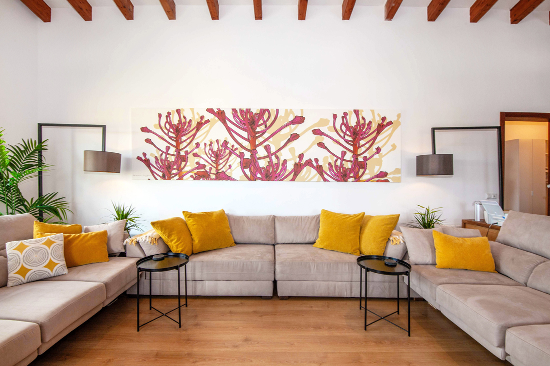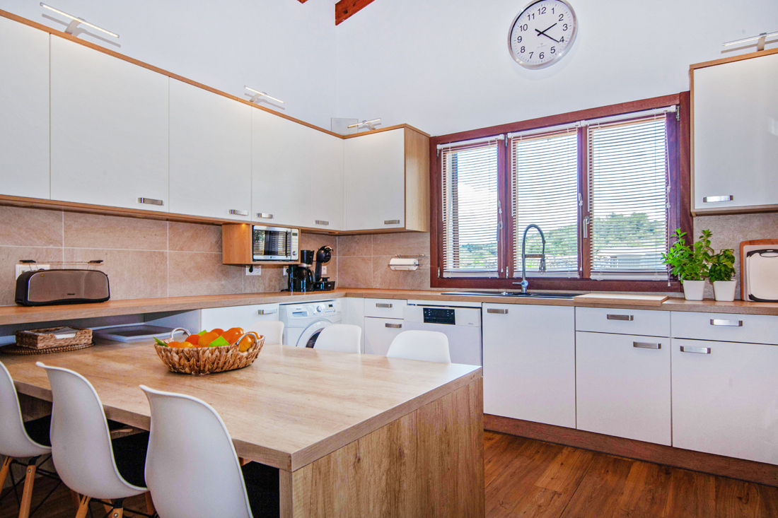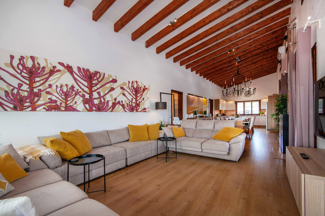 The living area features a large U-shaped sofa comfortably seating up to 8 persons, a 60" 4K UHD Smart TV with British, German and Spanish Satellite channels, and Netflix in English, German, Spanish, and French. A 2 x 2m picture window provides a panoramic view overlooking vinyeards, the local village, and the mountains.