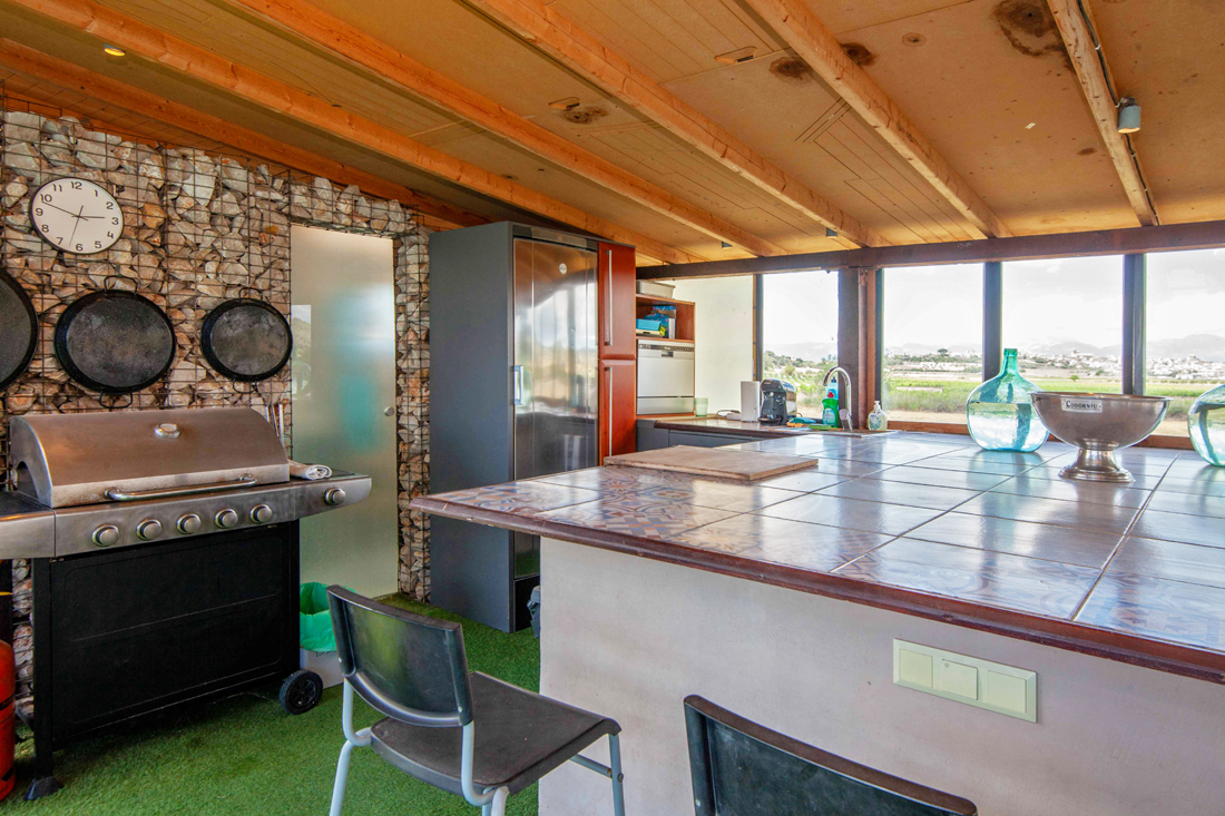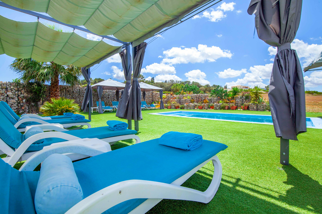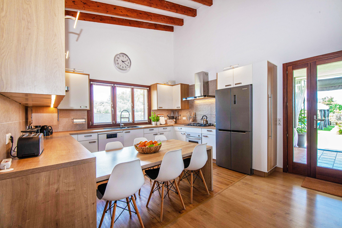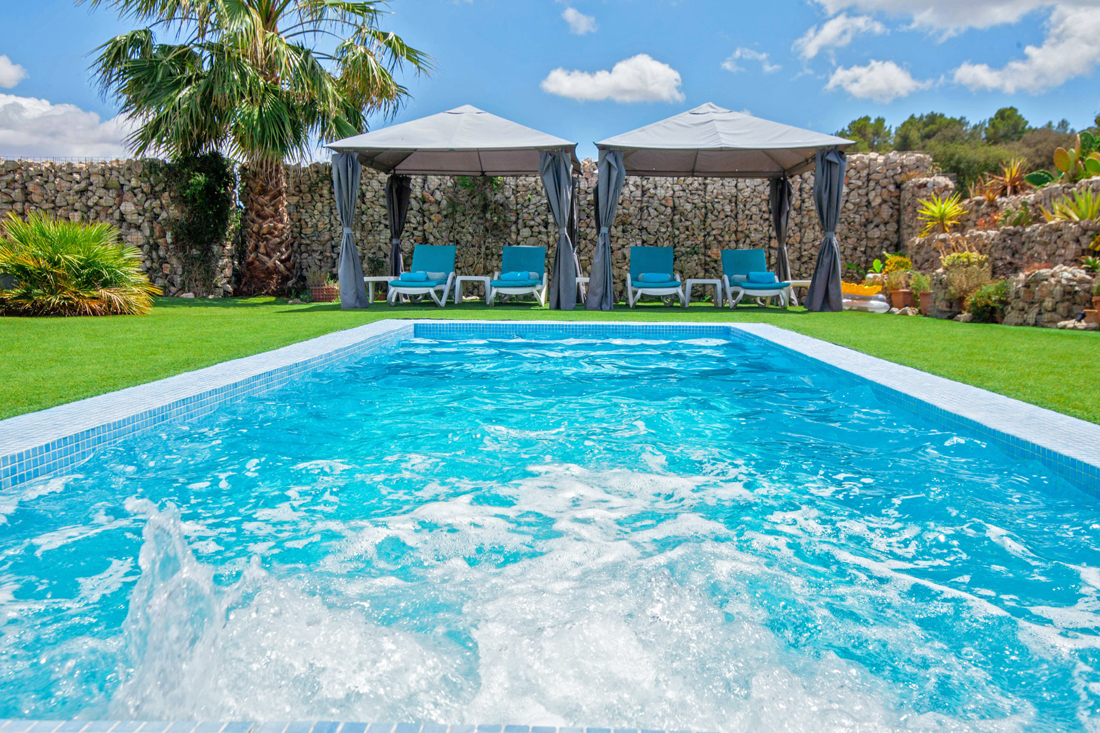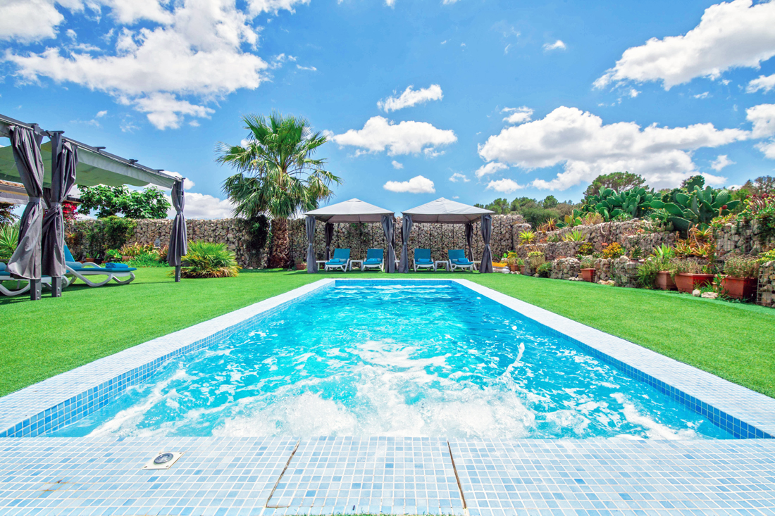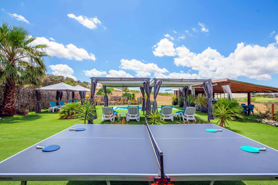 The pool area features a 6m x 3m saltwater pool, shaded sun loungers for up to 8 persons, an outdoor full bathroom, a area bar with a small kitchen - Barbecue grill, refrigerator, sink and dining accessories. Also a ping pong table. The spacious area is generously adorned with typical Mediterranean flora, including cactus, succulents and palms.