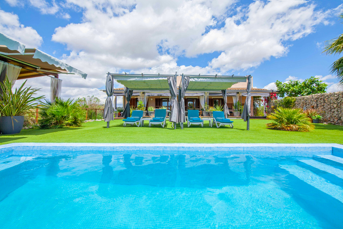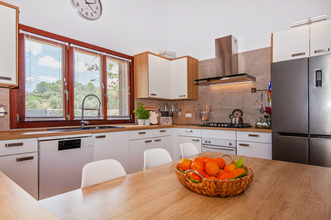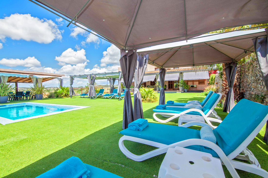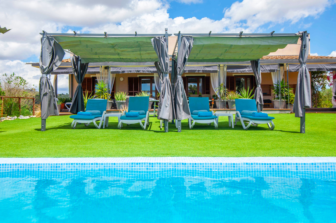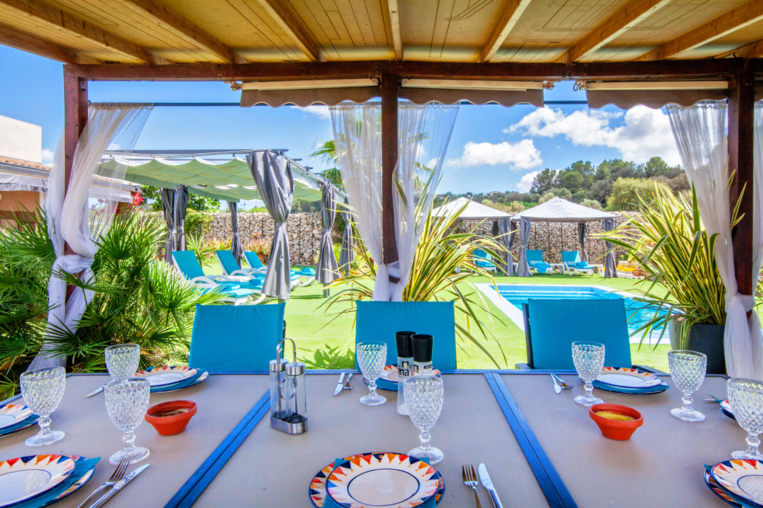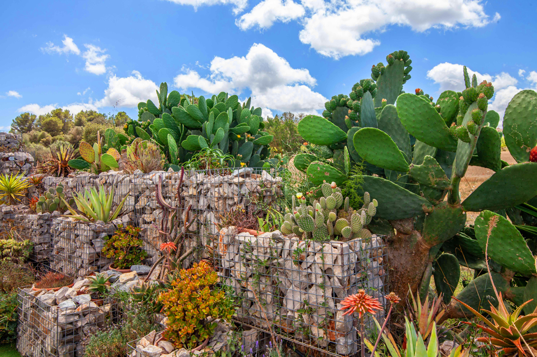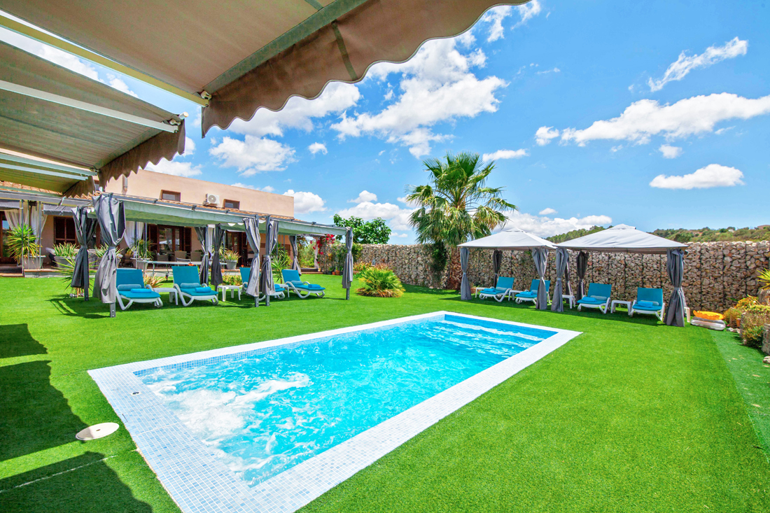 The pool area features a 6m x 3m saltwater pool, shaded sun loungers for up to 8 persons, an outdoor full bathroom, a area bar with a small kitchen - Barbecue grill, refrigerator, sink and dining accessories. Also a ping pong table. The spacious area is generously adorned with typical Mediterranean flora, including cactus, succulents and palms.